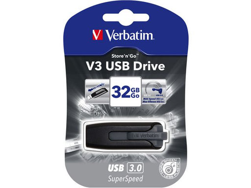 VerbatimUSB-minnepinne 3.0, Verbatim Store'n'Go V3. Sort USB-minnepinne med grå skyve- og låsemekanisme, låser fast når den brukes, og dras tilbake for å b...