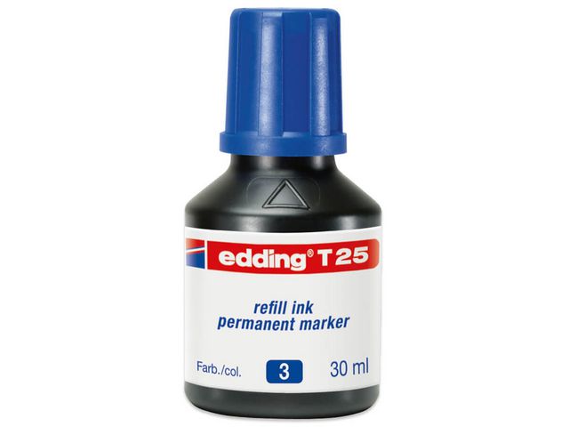 Make your permanent markers last longer with edding T25 refill ink - a smart, fast and economical solution for all standard edding permanent markers. The practical drop dispenser provides precise applications and refills the ink tightly and efficiently, without spills. Choose from ten vibrant colours so your favourite marker is always ready to use. The quick-drying, low-odour and water- and light-resistant formula ensures sharp, smudge-resistant marks that last. Key Selling Points 30ml refill ink For use with edding 1, 370, 390, 400, 500, 550, 800, 850, 2000C, 2200C, 3000, 3300 + EcoLine 21/22/25 Drop dispenser for precise refilling 10 colors available Permanent, low-odor, waterproof, smudge-resistant, light-resistant German quality Made in Germany 30 drops are often enough for one refill - Refill ink for marker pen - Drop dispenser for precise refilling - Permanent, low-odor, waterproof, smudge-resistant, light-resistant - Volume: 30ml - Color: Blue - For use with edding 1, 370, 390, 400, 500, 550, 800, 850, 2000C, 2200C, 3000, 3300 + EcoLine 21/22/27